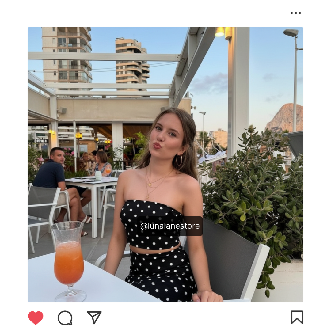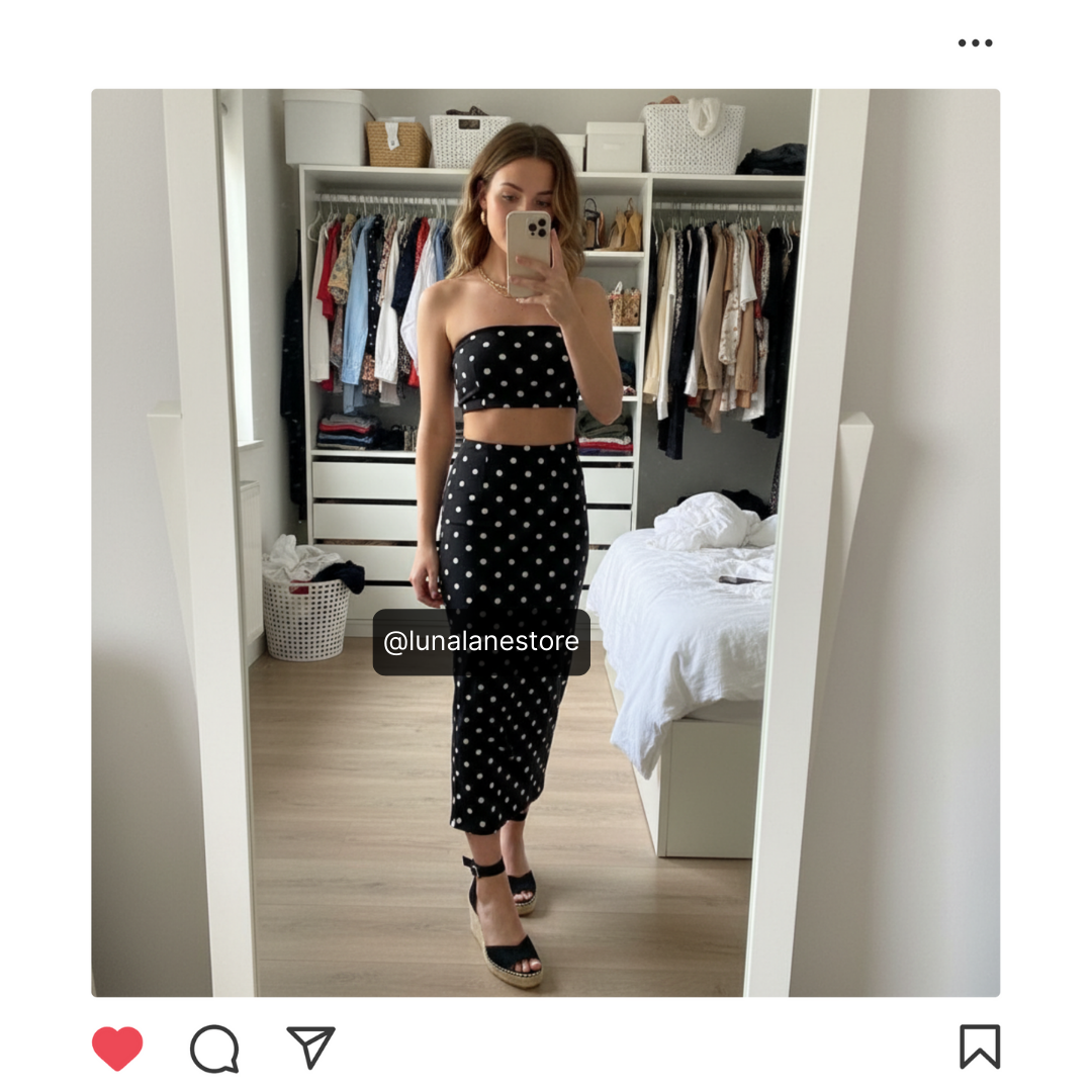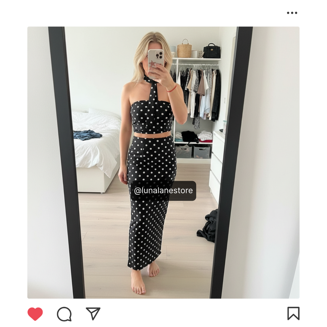 De strapless top en rok met speelse polka dots zorgen samen voor een elegante, maar toch flirty look. Of je nu een avond uit of brunchen gaat, dit setje laat je altijd stralen.